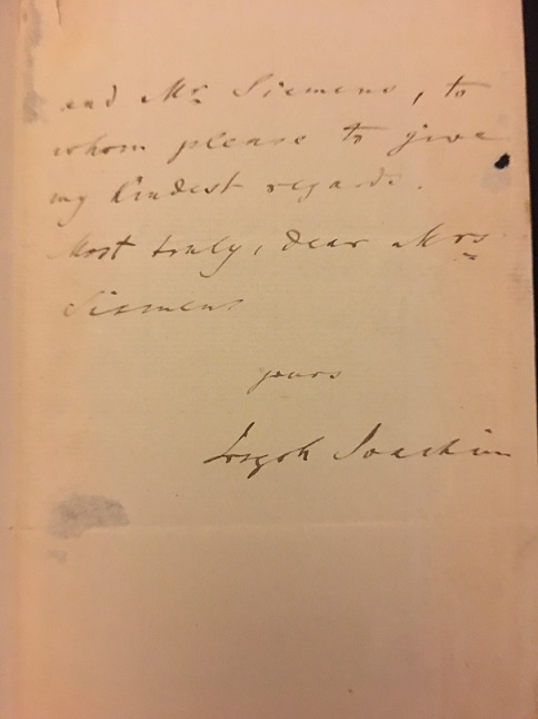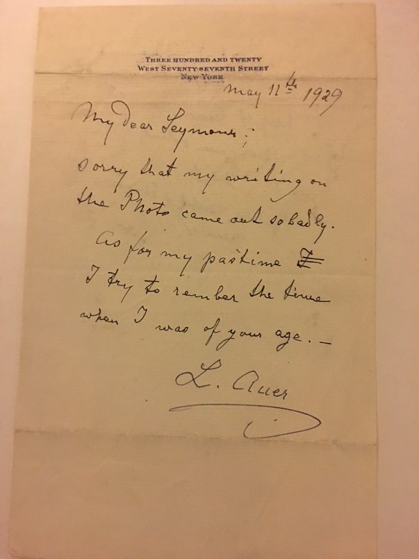 Joseph Joachim taught Leopold Auer (1845-1930) who came to him in Hanover in 1862 for lessons. Auer trained some of the greatest pedagogues of the 20th century - Heifetz, Milstein, Elman, Seidel, and many others who had long and successful careers. About Heifetz, he said, "He is not my student, he is a student of God." Of Milstein, he remarked to everyone in the room one time, "How do you like his Black Sea technique?!" Auer later emigrated to New York, where he charged a (then) stupendous $60.00 per hour for a lesson. He was a harsh taskmaster who accepted nothing less than the very highest performance level, even at lessons, which were usually open to the public. This letter was written just a year before he passed away. Heifetz played at his funeral.