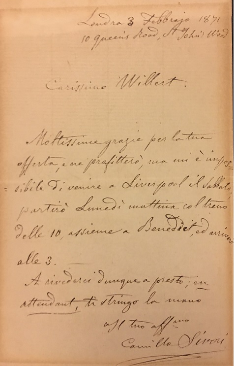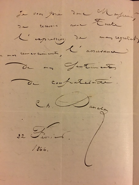 Belgian violinist-composer Henri Vieuxtemps (1820-1881) not only was a virtuoso, but he had a substantial oeuvre for the instrument and also some pieces for cello. In fact, Hector Berlioz said, "If Vieuxtemps were not a violinist, he would be known as an important composer." His best-known composition, written circa 1859 as a conservatory examination piece, was the Fifth Violin Concerto in A minor, op. 37. Indeed, over the course of one movement, which includes a most profound cadenza, every aspect of violin technique is covered. This 1855 letter was to a friend, asking the friend to help yet another friend, "and if you do so, it would be as if you were helping me." A glorious and unmistakable signature - very nicely spelled out, as more people did in those days versus simply dashing it off.
