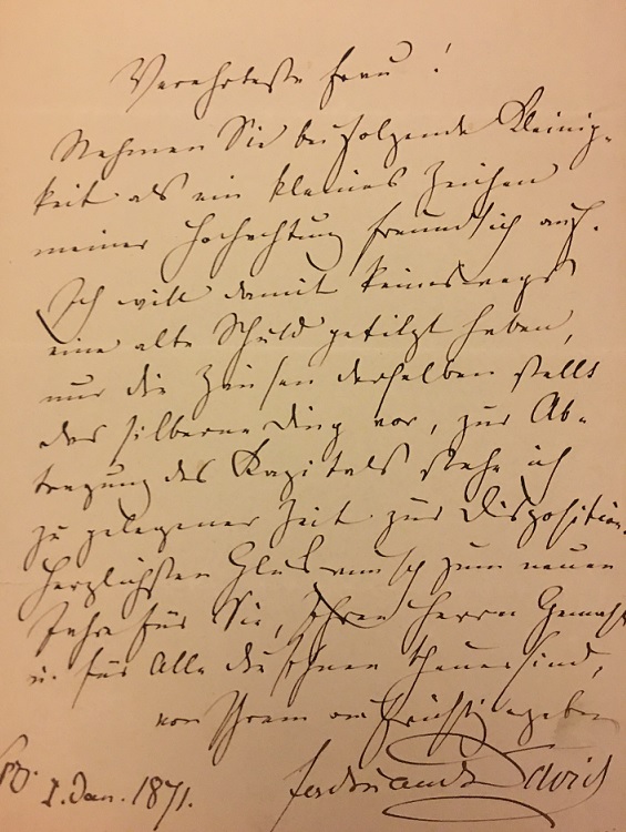 Ferdinand David, a pupil of violinist-composer Ludwig Spohr, was one of the great early romantic era violinists. He premiered the Mendelssohn Concerto and came up with the initial fingerings and bowings of the piece that were used at that time by himself and a few others who were early players of this warhorse. He even played the Beethoven Concerto in a concert with Mendelssohn conducting! This letter is dated 1871, written in Leipzig.