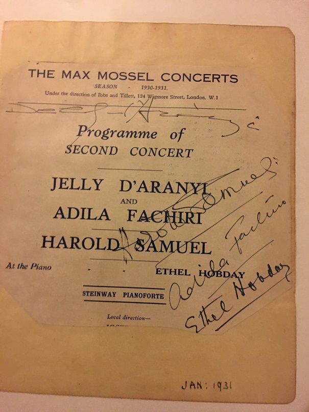 Adila Fachiri (1889-1962) and her sister Jelly d'Aranyi (1893-1966) were a well-known violin duo who toured extensively, mostly in Europe, where they lived. They were the grand-nieces of Joseph Joachim. d'Aranyi was the dedicatee of one of the most popular pieces in the violin repertoire, "Tzigane" by Maurice Ravel. Interestingly, they both lived for 73 years and died 4 years apart, the exact difference in their ages.