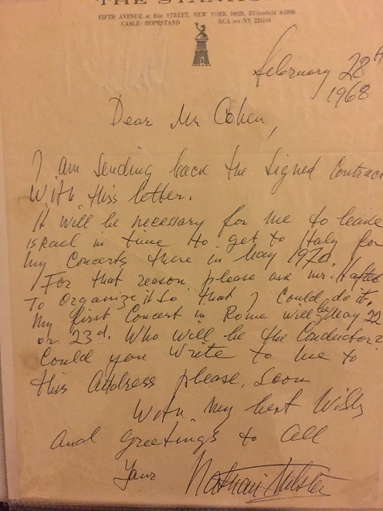 The contract mentioned in the letter above. Signed and agreed to!! At a fee of only $1,000 (net) per concert, the great Maestro was obviously performing these concerts mostly as a charitable donation to Israel. His usual fees were substantially more than this, although always well below what Heifetz and Rubinstein and some other asked for - and got.