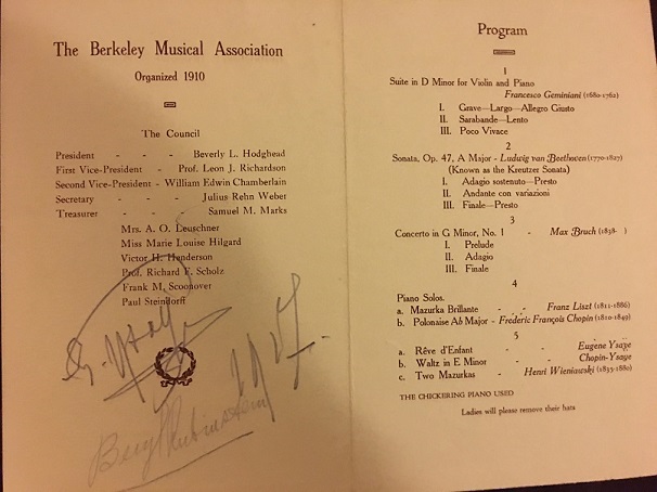Belgian violinist-composer Eugene Ysaye (1858-1931) not only was a virtuoso, but like his countryman and contemporary Vieuxtemps, he also had a substantial oeuvre for the instrument. His six sonatas for violin alone are mammoth, and an important part of the violin literature. He was also the inspiration for some pieces written by bigger composers such as Chausson, who dedicated the "Poeme" to him, which was somewhat derived from Ysaye's earlier "Poeme Elegaique", a seldom-heard but heartwrenchingly beautiful piece (played with the G string tuned to F.) This 1917 San Francisco California concert program was also signed by Ysaye's wife, plus the pianist Beryl Rubinstein and violinist Louis Persinger, who lived in the area and later trained such giants as Isaac Stern, Yehudi Menuhin, and Ruggiero Ricci.