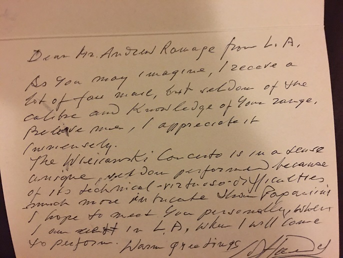 For the past 15 years or so, I have infrequently collected a good number of what I call violin artifacts - museum pieces, if you will, that encompass 160+ years of classical violin history. I have acquired these from many different people and places, including a few who were good enough to sign for me via the postal service. A few of these items have highly interesting stories behind them. Sadly, the asking prices of these things have skyrocketed in recent years, although their fair market value based on their lifetimes and the relative scarcity has not changed [very much]. **What you see below are absolutely not photocopies!!**
