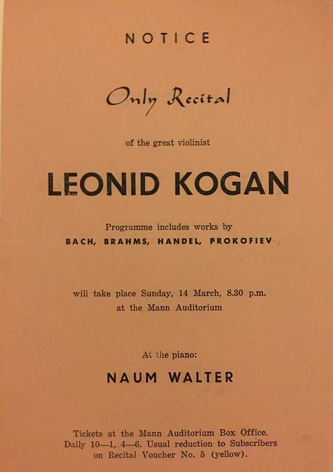 Leonid Kogan (1924-1982) was a professor of violin at the Moscow Conservatory, where David Oistrakh also taught while not on concert tours. Although 20 years younger than David Oistrakh, he shared the distinction of being one of the several finest violinists of the former Soviet Union. Reportedly he even studied with Oistrakh for a brief time. But violinistically, the two men could not have been more different. Kogan's interpretations were more modern-sounding, whereas Oistrakh's tended to be products of the romantic era. Kogan had a very narrow vibrato and had an agile bow arm that was well-equipped for Paganini, whose works he championed. He also had a facile left hand that, to quote one critic, "had such dexterity that he never had to 'get ready, get set' before executing the most difficult passagework." Kogan died prematurely of undiagnosed heart problems, while on a concert tour. Of all places, he died in the back of a train.