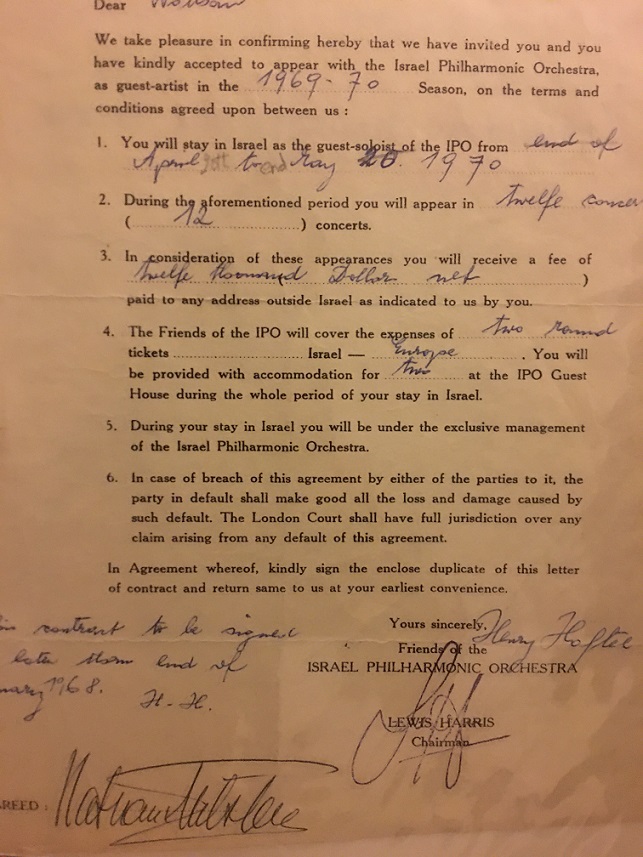 The contract mentioned in the letter above. Signed and agreed to!! At a fee of only $1,000 (net) per concert, the great Maestro was obviously performing these concerts mostly as a charitable donation to Israel. His usual fees were substantially more than this, although always well below what Heifetz and Rubinstein and some other asked for - and got.