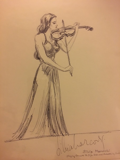 Silvia Marcovici (1952-) is a Roumanian violinist who concertized frequently around the world from the late 1960s until the early 2000s. She was a top prizewinner in the Enesco and Long-Thibaud Competitions, and in 1972 Decca records released a record of a live performance of the Glazunov Concerto with Stokowski, who had conducted the first performances of this concerto in the early 1900s. She has been on the faculty of several universities in Europe for many years. Although she did not record a lot, she remains well-known to a legion of violinists. Her playing was very similar to that of Szeryng and other European masters - she had a high bow arm and an absolute technique, which included a flawless left hand. This sketch was done during a concert and signed by her afterwards! I was fortunate to hear her a couple times in Oregon, when she performed with the Oregon Symphony in the late 80s and early 90s. She was very much liked in Oregon!!