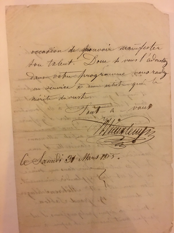 Belgian violinist-composer Henri Vieuxtemps (1820-1881) not only was a virtuoso, but he had a substantial oeuvre for the instrument and also some pieces for cello. In fact, Hector Berlioz said, "If Vieuxtemps were not a violinist, he would be known as an important composer." His best-known composition, written circa 1859 as a conservatory examination piece, was the Fifth Violin Concerto in A minor, op. 37. Indeed, over the course of one movement, which includes a most profound cadenza, every aspect of violin technique is covered. This 1855 letter was to a friend, asking the friend to help yet another friend, "and if you do so, it would be as if you were helping me." A glorious and unmistakable signature - very nicely spelled out, as more people did in those days versus simply dashing it off.