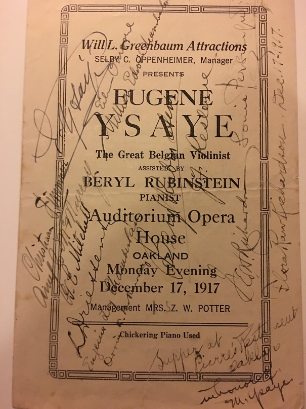 Belgian violinist-composer Eugene Ysaye (1858-1931) not only was a virtuoso, but like his countryman and contemporary Vieuxtemps, he also had a substantial oeuvre for the instrument. His six sonatas for violin alone are mammoth, and an important part of the violin literature. He was also the inspiration for some pieces written by bigger composers such as Chausson, who dedicated the "Poeme" to him, which was somewhat derived from Ysaye's earlier "Poeme Elegaique", a seldom-heard but heartwrenchingly beautiful piece (played with the G string tuned to F.) This 1917 San Francisco California concert program was also signed by Ysaye's wife, plus the pianist Beryl Rubinstein and violinist Louis Persinger, who lived in the area and later trained such giants as Isaac Stern, Yehudi Menuhin, and Ruggiero Ricci.